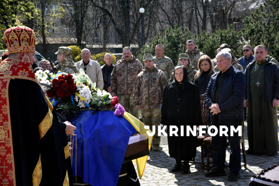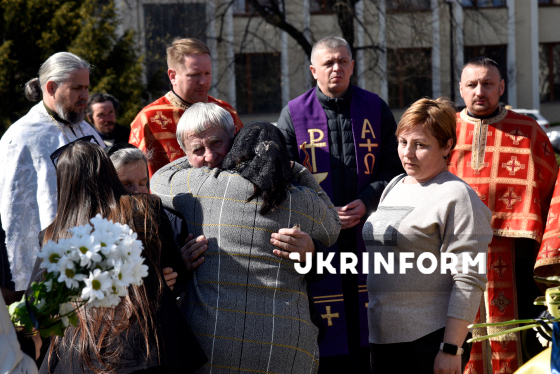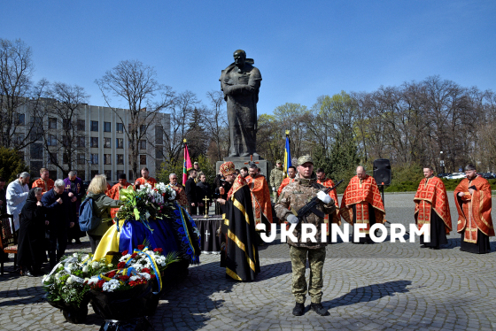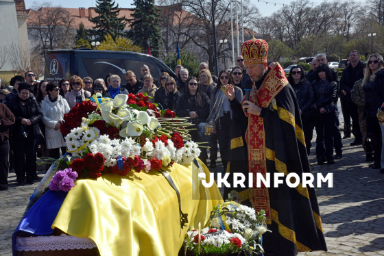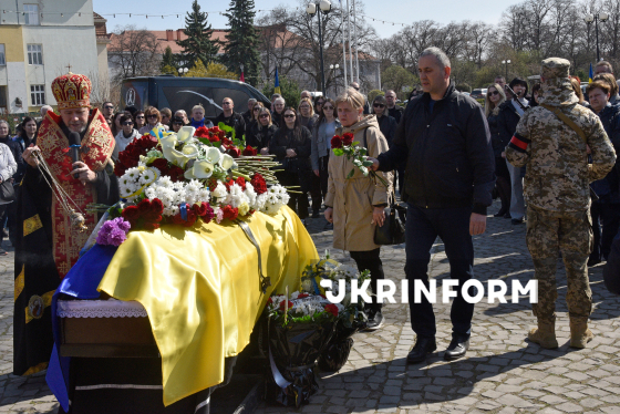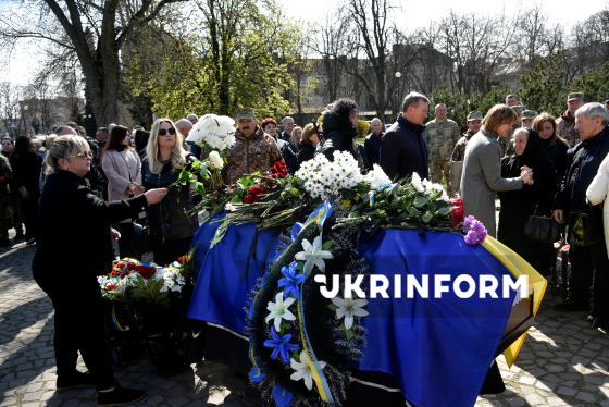 Люди прощаються з сержантом 94-го прикордонного загону ДПСУ (Чопський прикордонний загін) Василем Голінкою, який загинув 29 січня 2025 року на Курському напрямку, виконуючи бойове завдання, на площі Народній біля памʼятника Тарасові Шевченку, Ужгород, 23 березня 2026 року.