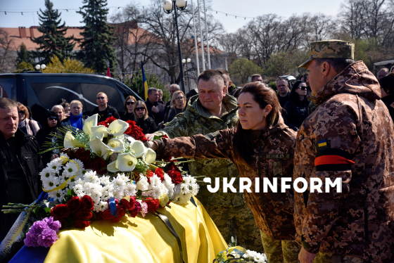 Дівчина покладає квіти до труни з тілом сержанта 94-го прикордонного загону ДПСУ (Чопський прикордонний загін) Василя Голінки, який загинув 29 січня 2025 року на Курському напрямку, виконуючи бойове завдання, під час церемонії прощання на площі Народній біля памʼятника Тарасові Шевченку, Ужгород, 23 березня 2026 року.