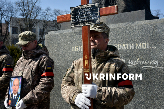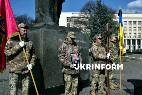 Військові тримають хрест та портрет сержанта 94-го прикордонного загону ДПСУ (Чопський прикордонний загін) Василя Голінки, який загинув 29 січня 2025 року на Курському напрямку, виконуючи бойове завдання, під час церемонії прощання на площі Народній біля памʼятника Тарасові Шевченку, Ужгород, 23 березня 2026 року.