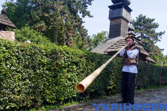 Чоловік грає грає на трембіті під час етнофестивалю “Цвіт Папороті” на території Закарпатського музею народної архітектури та побуту, Ужгород, 26 липня 2025 року.