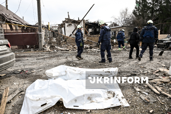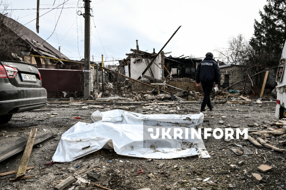 Правоохоронець проходить неподалік від мішків з тілами загиблих внаслідок російської дронової атаки у приватному секторі в одному з районів Запоріжжя, 21 березня 2026 року. Вранці 21 березня російські окупанти вчергове атакували Запоріжжя ударними безпілотниками. Внаслідок обстрілу загинуло двоє мирних жителів, ще кілька людей отримали поранення, серед них - діти.