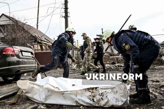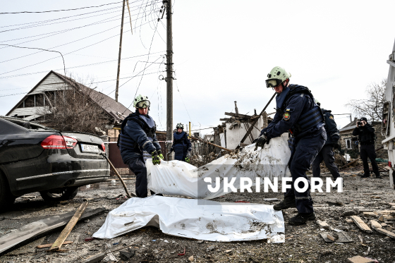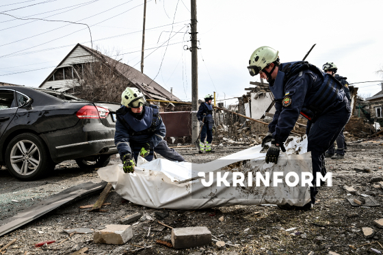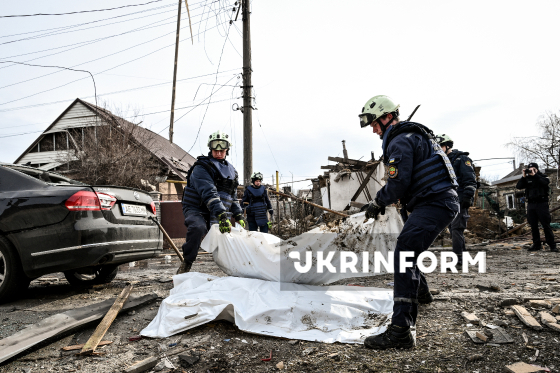 Рятувальники стоять біля мішків з тілами загиблих внаслідок російської дронової атаки у приватному секторі в одному з районів Запоріжжя, 21 березня 2026 року. Вранці 21 березня російські окупанти вчергове атакували Запоріжжя ударними безпілотниками. Внаслідок обстрілу загинуло двоє мирних жителів, ще кілька людей отримали поранення, серед них - діти.