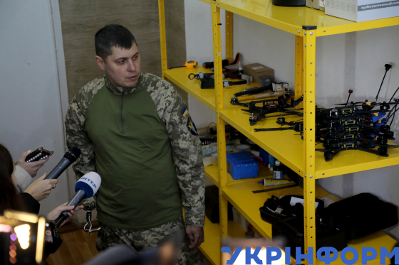 Ветеран, переможець конкурсної програми “Варто: золоті руки” Українського ветеранського фонду Вʼячеслав Стражець, який виготовляє безпілотні літальні апарати “Джміль 4.5.0”, показує представникам медіа дрони у межах престуру ветеранськими бізнесами від Українського ветеранського фонду на Вінниччину, 14 листопада 2023 року.