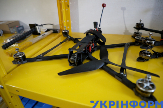 Розписаний прапор України у приміщенні, де ветеран, переможець конкурсної програми “Варто: золоті руки” Українського ветеранського фонду Вʼячеслав Стражець виготовляє безпілотні літальні апарати “Джміль 4.5.0”, Вінницька область, 14 листопада 2023 року.