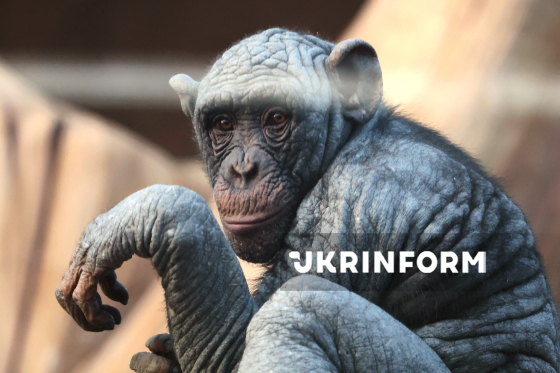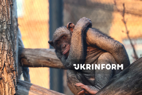 Шимпанзе сидить у вольєрі на території Харківського зоопарку, Харків, 4 листопада 2025 року.