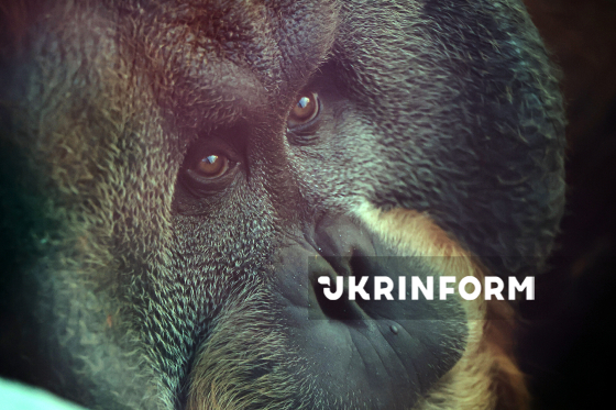 Суматранський огрангутан сидить у вольєрі на території Харківського зоопарку, Харків, 4 листопада 2025 року.