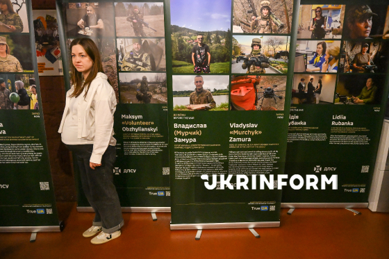 Жінка роздивляється стенди з історіями людей, які стали на захист України в лавах Державної прикордонної служби, на презентації фотовиставки “Обличчя кордону” у Медіацентрі Україна, Київ, 26 березня 2026 року.