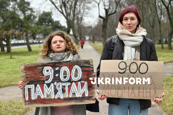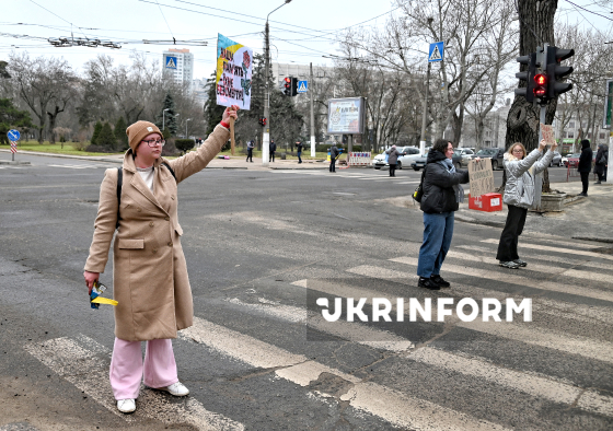 Активістки з плакатами нагадують містянам про щоденну хвилину мовчання на честь загиблих від збройної агресії РФ під час традиційної акції "Зупинись. Вшануй пам’ять героїв!", Одеса, 25 лютого 2026 року. Згідно з указом Президента України, вшанування пам’яті оголошується щодня о 9-й ранку в усіх містах України.