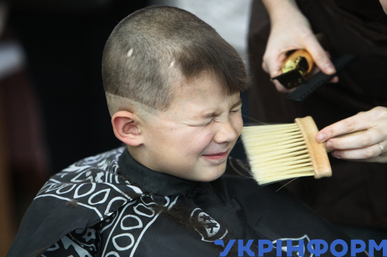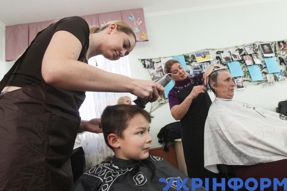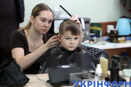 Перукар навчального центру "СЕРЖ і НАТАЛІ" робить стрижку хлопчику у приміщенні Чумаківської ОТГ під час благодійного заходу, організованого ГО "Всеукраїнська Об`єднана Академія Козацтва" до Міжнародного дня людей похилого віку та Дня ветеранів, Дніпропетровська область, 6 жовтня 2025 року. Перукарі впродовж дня зробили стрижки та зачіски майже шістдесяти мешканцям Чумаківської ТГ. Безкоштовні послуги могли отримати люди похилого віку, маломобільні та особи з інвалідністю, діти з багатодітних родин, малозабезпечені та тимчасово переміщені особи.