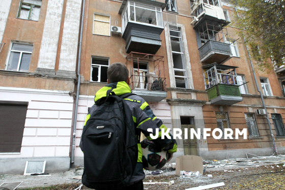 Хлопчик з футбольним м`ячем у руках дивиться на понівечений внаслідок російського обстрілу у ніч на 6 листопада житловий будинок, Дніпро, 7 листопада 2025 року.