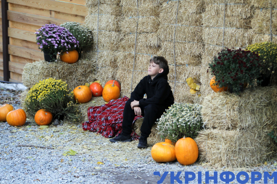 Хлопчик позує для фото серед гарбузів, хризантем і снопів сіна, Дніпро, 5 жовтня 2025 року.