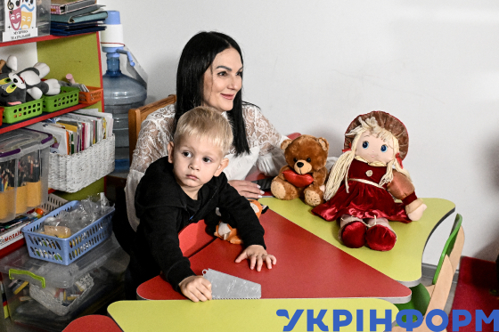 Вихователька та хлопчик сидять за столом під час заняття у закладі дошкільної освіти (ясла-садок) №100 “Гармонія”, Запоріжжя, 21 жовтня 2025 року. Вперше з початку повномасштабного вторгнення РФ в Україну у Запоріжжі відновили роботу тринадцять ясельних груп для дітей до трьох років у дев`яти закладах дошкільної освіти. Працюють вони у скороченому режимі — до трьох годин.