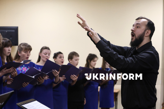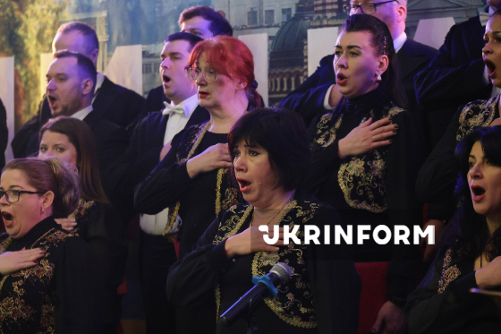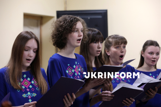 Народна академічна хорова капела імені Павла Чубинського виступає на релігійному заході “Світло молитви над Україною”, приуроченого до Національного дня молитви, у церкві Святого Андрія Первознанного у четверті роковини повномасштабного вторгнення Росії в Україну, Буча, Бучанський район, Київська область, 24 лютого 2026 року.