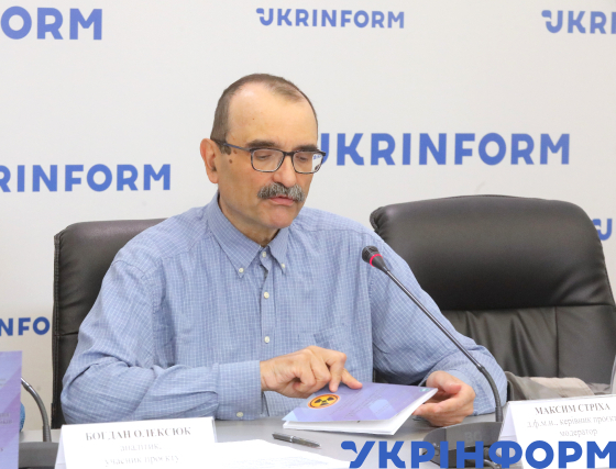 Аналітик, учасник проєкту Богдан Олексюк під час пресконференції на тему: "Презентація звіту щодо відповіді українського експертного середовища на російську дезінформацію у ядерній сфері України", Київ, 30 травня 2024 року.