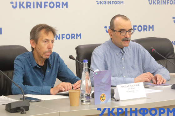 Д.ф.м.н., керівник проєкту, модератор Максим Стріха (праворуч) та аналітик, учасник проєкту Богдан Олексюк під час пресконференції на тему: "Презентація звіту щодо відповіді українського експертного середовища на російську дезінформацію у ядерній сфері України", Київ, 30 травня 2024 року.