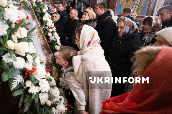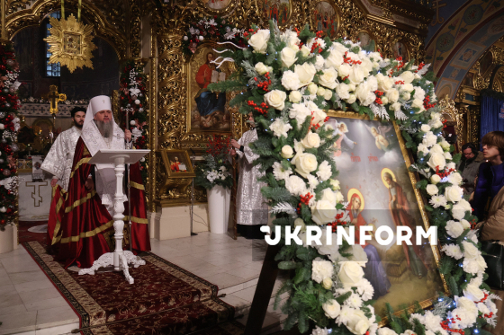 Вірянки прикладаються до ікони під час ранкової божественної літургії з нагоди свята Різдва Христового, яку очолив Блаженнійший Митрополит Київський і всієї України Епіфаній, у кафедральному Свято-Михайлівському Золотоверхому соборі столиці, Київ, 25 грудня 2025 року.