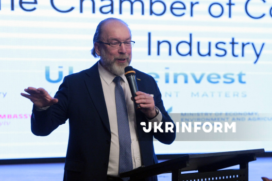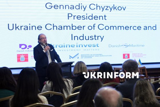 Президент Торгово-промислової палати України Геннадій Чижиков виступає з промовою під час Ukraine-Denmark Business Partnership and Investment Forum, що об’єднав данські компанії, представників українських органів влади, міжнародних фінансових інституцій та інших ключових стейкхолдерів із секторів оборони, морської галузі та критичної інфраструктури. Київ, 2 березня 2026 року.