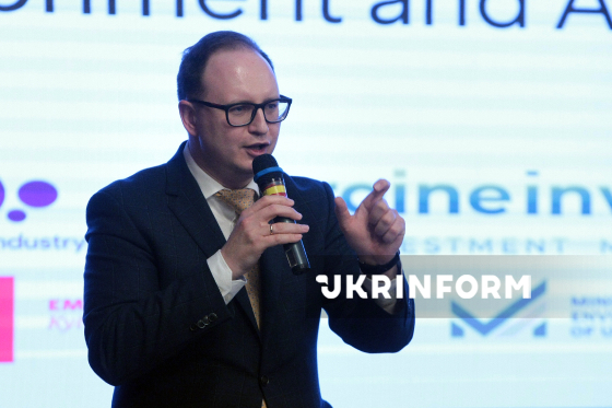 Заступник міністра економіки, довкілля та сільського господарства України Єгор Перелигін виступає з промовою під час Ukraine-Denmark Business Partnership and Investment Forum, що об’єднав данські компанії, представників українських органів влади, міжнародних фінансових інституцій та інших ключових стейкхолдерів із секторів оборони, морської галузі та критичної інфраструктури. Київ, 2 березня 2026 року.