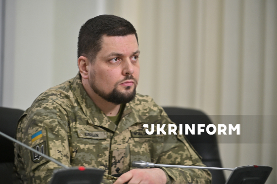 Модератор, офіцер відділу взаємодії з медіа управління зв’язків з громадськістю ГУК ЗСУ, майор Андрій Ковальов бере участь у брифінгу на тему: ”Військові інновації у 2025 році: результати, досягнення, вектори розвитку на 2026 рік”, Київ, 5 березня 2026 року.