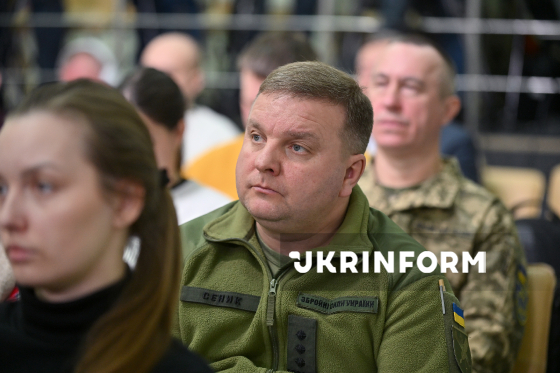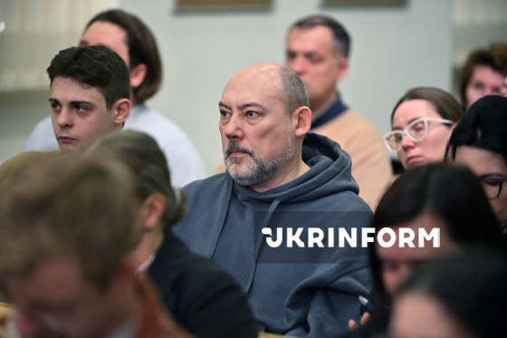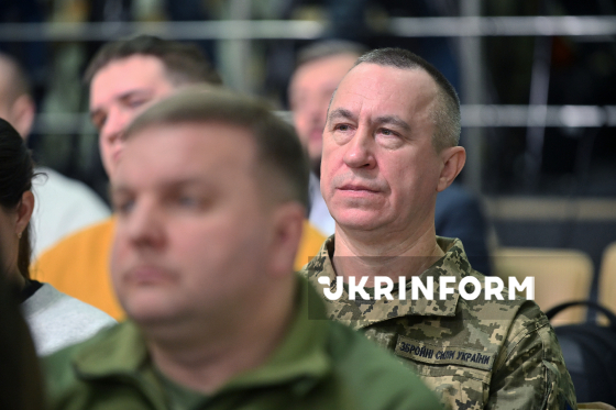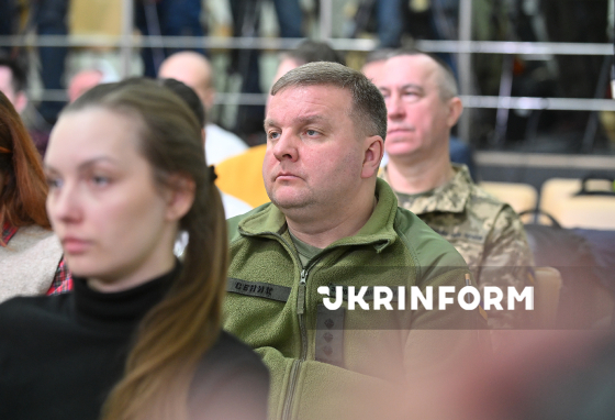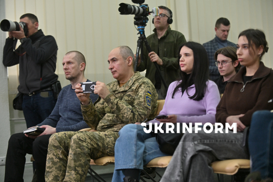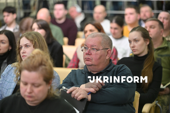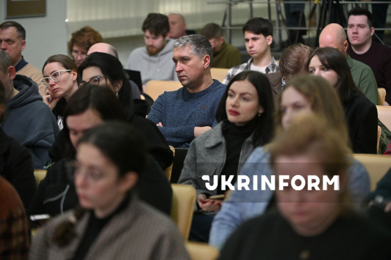 Відвідувачі слухають учасників брифінгу на тему: ”Військові інновації у 2025 році: результати, досягнення, вектори розвитку на 2026 рік”, Київ, 5 березня 2026 року.