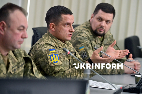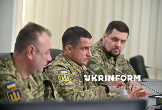Начальник Центрального управління інноваційної діяльності Збройних сил України, полковник Віталій Добрянський, бригадний генерал, заступник Головнокомандувача Збройних сил України Андрій Лебеденко та модератор, офіцер відділу взаємодії з медіа управління зв’язків з громадськістю ГУК ЗСУ, майор Андрій Ковальов (зліва направо) беруть участь у брифінгу на тему: ”Військові інновації у 2025 році: результати, досягнення, вектори розвитку на 2026 рік”, Київ, 5 березня 2026 року.