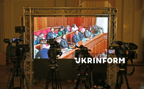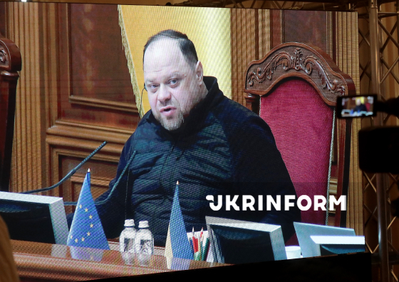 Голова Верховної Ради України Руслан Стефанчук бере участь у засіданні парламенту, яке транслюється для представників ЗМІ у пресцентрі ВРУ, Київ, 14 січня 2026 року. У межах засідання ВР призначила Дениса Шмигаля на посаду першого віцепрем’єр-міністра - міністра енергетики України, рішення підтримали 248 народних депутатів. (Фото з екрану трансляції засідання ВРУ у пресцентрі парламенту)