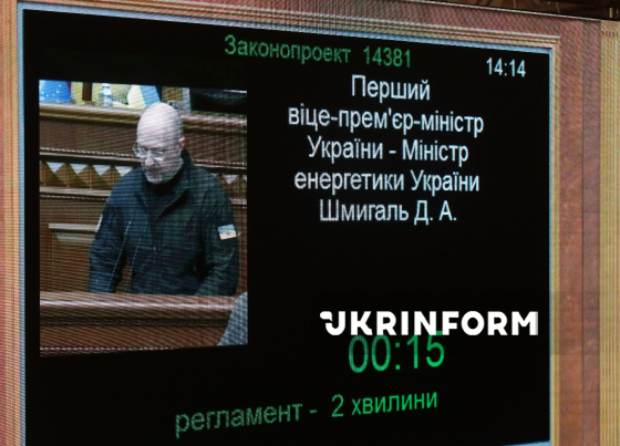 Перший віцепрем’єр-міністр - міністр енергетики України Денис Шмигаль, призначення якого підтримали 248 народних депутатів, виступає з промовою під час засідання парламенту, Київ, 14 січня 2026 року. (Фото з екрану трансляції засідання ВРУ у пресцентрі парламенту)