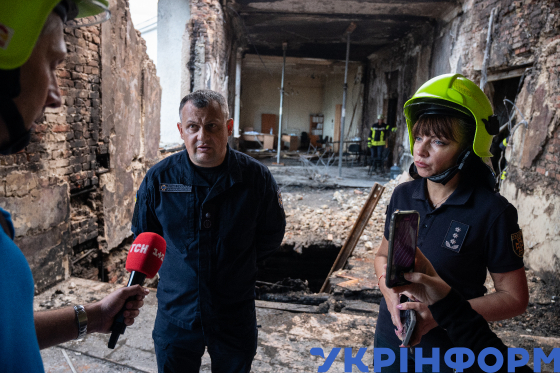 Голова ДСНС України Андрій Даник і речниця ГУ ДСНС України у місті Києві Світлана Водолага під час брифінгу щодо наслідків удару росіян по будівлі Кабінету Міністрів України, Київ, 8 вересня 2025 року.