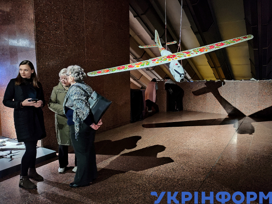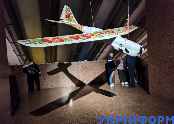 Безпілотний літальний апарат, оздоблений петриківським розписом, під час виставки "Загроза з неба" у Національному музеї історії України у Другій світовій війні, Київ, 20 жовтня 2023 року.