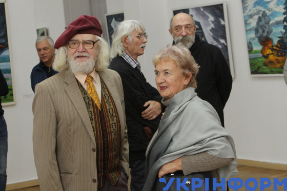 Художник, майстер олійного та акварельного живопису, автор виставки Михайло Кублик і голова Спілки жінок м. Дніпра та Дніпропетровської області Валентина Тальян на відкритті виставки “Палає Україна” у Дніпровському художньому музеї, Дніпро, 26 жовтня 2023 року.
