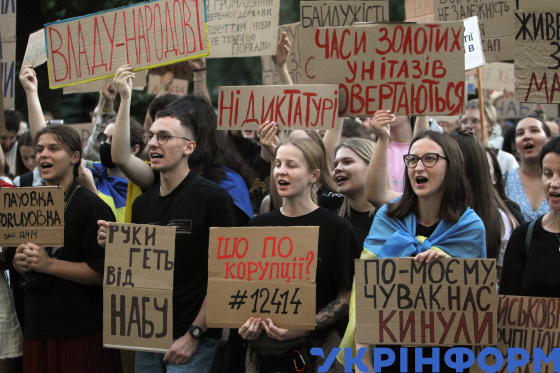 Активісти з плакатами у руках мітингують проти ухваленого парламентом та підписаного Президентом закону про обмеження повноважень Національного антикорупційного бюро України та Спеціалізованої антикорупційної прокуратури біля Дніпропетровської ОДА (ОВА), Дніпро, 24 липня 2025 року.