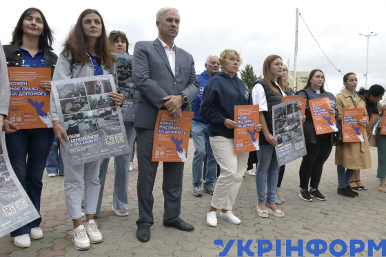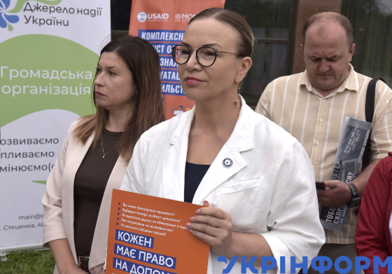 Жінка беруть плакати під час відкриття обласної інформаційно-просвітницької акції “Вінниччина проти торгівлі людьми” у Всесвітній день боротьби з торгівлею людьми, Вінниця, 30 липня 2024 року.