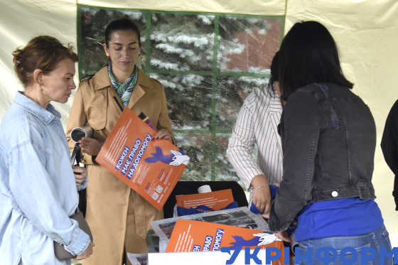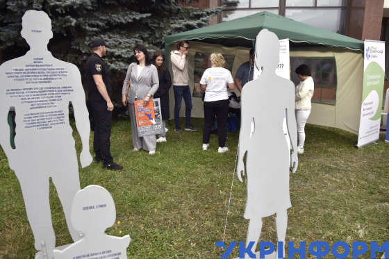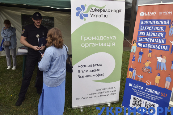 Люди спілкуються біля інформаційно-консультативного пункту з питань протидії торгівлі людьми “Були в рабстві? Звернись! Отримай допомогу!” під час відкриття обласної інформаційно-просвітницької акції “Вінниччина проти торгівлі людьми” у Всесвітній день боротьби з торгівлею людьми, Вінниця, 30 липня 2024 року.