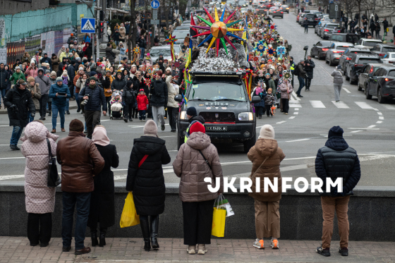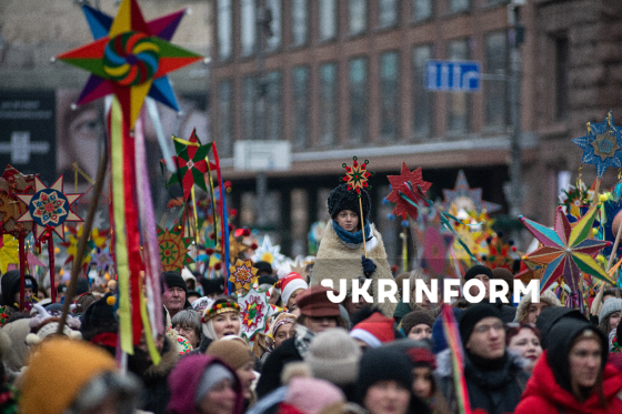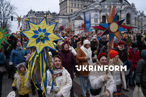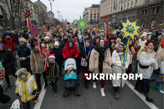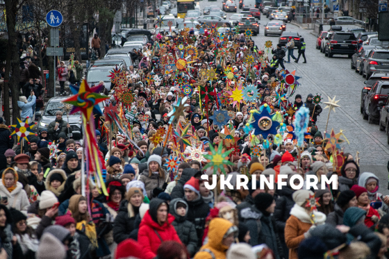 Учасники Різдвяної ходи, організованої з метою продовження давніх українських традицій, підтримки одне одного в умовах війни та вшанування пам’яті полеглих українських захисників, проходять із зірками Хрещатиком у бік Майдану Незалежності, Київ, 25 грудня 2025 року.