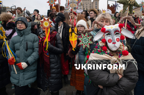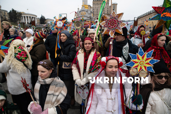 Учасники Різдвяної ходи із зірками, організованої з метою продовження давніх українських традицій, підтримки одне одного в умовах війни та вшанування пам’яті полеглих українських захисників, колядують на Майдані Незалежності, Київ, 25 грудня 2025 року.