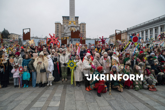 Учасники Різдвяної ходи із зірками, організованої з метою продовження давніх українських традицій, підтримки одне одного в умовах війни та вшанування пам’яті полеглих українських захисників, позують для фото на Майдані Незалежності, Київ, 25 грудня 2025 року.