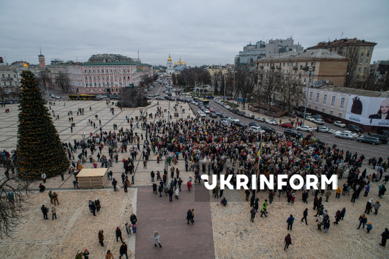 Зібрання учасників на Софійській площі біля головної новорічної ялинки країни перед початком Різдвяної ходи з зірками центром столиці, організованої з метою продовження давніх українських традицій, підтримки одне одного в умовах війни та вшанування пам’яті полеглих українських захисників, Київ, 25 грудня 2025 року.