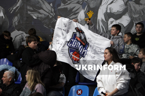 Вболівальники демонструють банер під час матчу чемпіонату України з баскетболу серед команд Суперліги між БК "Харківські Соколи" та БК "Рівне-ОШВСМ", що завершився перемогою господарів з рахунком 83:76, на трибунах КСК "Шинник", Дніпро, 10 січня 2026 року.