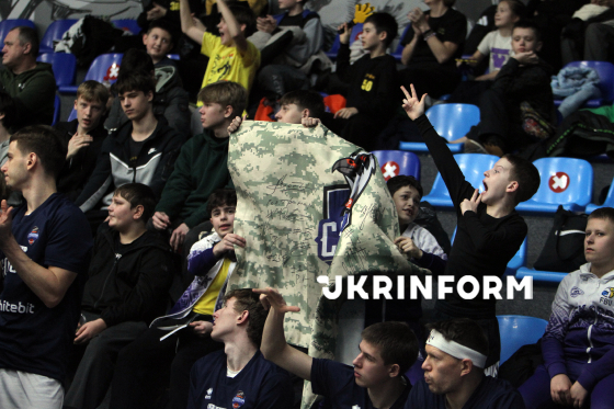Вболівальники беруть участь матчі чемпіонату України з баскетболу серед команд Суперліги між БК "Дніпро" та миколаївським БК "Ніко-Баскет", що завершився перемогою господарів з рахунком 119:83, в СК "Шиннік", Дніпро, 15 лютого 2026 року.