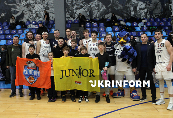 Хлопчики роблять селфі разом із гравцем БК "Харківські Соколи" Ігорем Клімовим після матчу чемпіонату України з баскетболу серед команд Суперліги проти БК "Рівне-ОШВСМ", що завершився перемогою господарів з рахунком 83:76, на майданчику КСК "Шинник", Дніпро, 10 січня 2026 року.