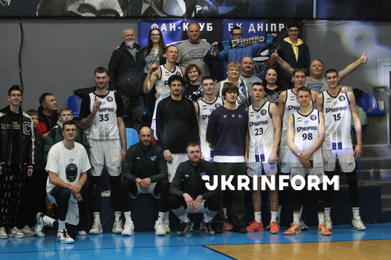 Гравці БК "Дніпро" позують для фото разом із уболівальниками після чемпіонату України з баскетболу серед команд Суперліги проти миколаївського БК "Ніко-Баскет", що завершився перемогою господарів з рахунком 119:83, на майданчику СК "Шиннік", Дніпро, 15 лютого 2026 року.