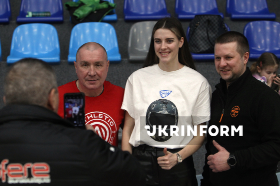 Олімпійська чемпіонка та рекордсменка світу зі стрибків у висоту Ярослава Магучіх позує для фото разом із уболівальниками під час флешмобу на підтримку українського спортсмена Владислава Гераскевича, якого дискваліфікували з Олімпійських ігор 2026 через намір виступати в "Шоломі пам’яті", перед початком матчу чемпіонату України з баскетболу серед команд Суперліги між БК "Дніпро" та миколаївським БК "Ніко-Баскет" у СК "Шиннік", Дніпро, 15 лютого 2026 року.