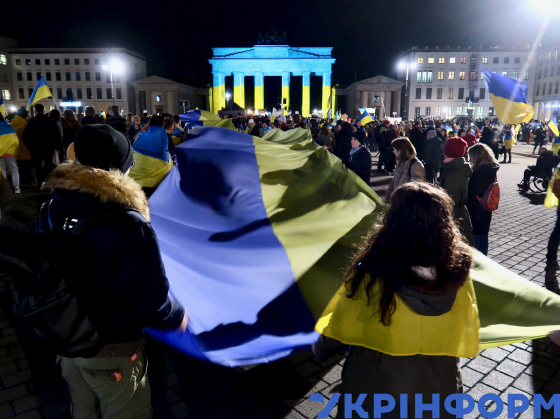 Учасники розгорнули прапор України під час акції до третіх роковин повномасштабного вторгнення рф в Україну, проведеної в межах кампанії “Stand With Ukraine! Unite for Ukrainian Victory!” Світового конгресу українців (СКУ) у Берліні, Німеччина, 24 лютого 2025 року.