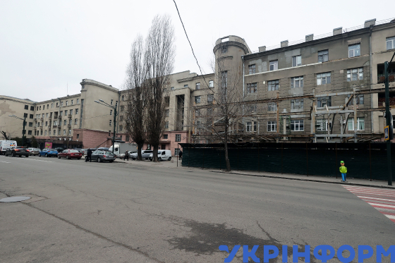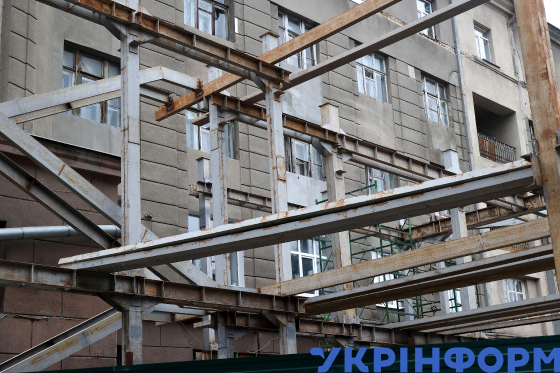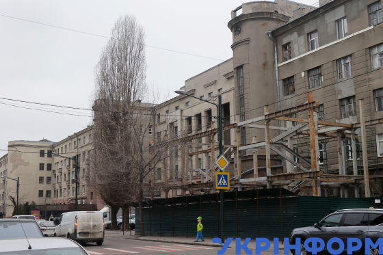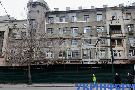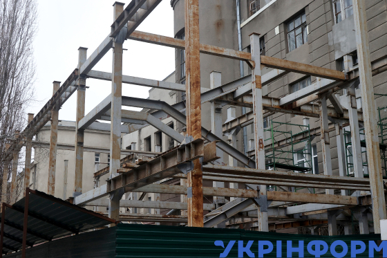 Будівництво ресторану біля будівлі гуртожитку Харківського політехнічного інституту, також відомої як "Гігант", яка є пам’яткою архітектури в стилі конструктивізму, Харків, 23 січня 2025 року.