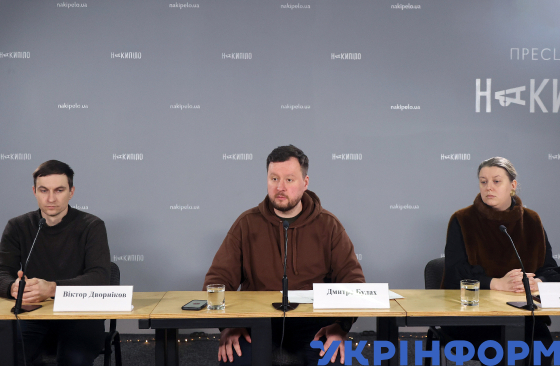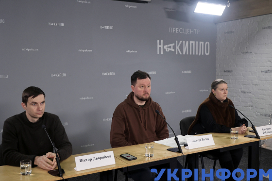 Архітектор, співзасновник платформи урбаністичного розвитку Віктор Дворніков, керівник Харківського антикорупційного центру, депутат Харківської міської ради Дмитро Булах та архітекторка-реставраторка, співзасновниця Платформи урбаністичного розвитку Катерина Кублицька (зліва направо) під час пресконференції щодо будівництва ресторану біля будівлі гуртожитку Харківського політехнічного інституту, також відомої як "Гігант", яка є пам’яткою архітектури в стилі конструктивізму, Харків, 23 січня 2025 року.