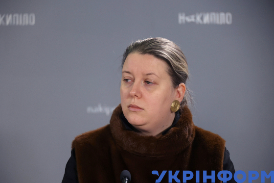 Архітекторка-реставраторка, співзасновниця Платформи урбаністичного розвитку Катерина Кублицька під час пресконференції щодо будівництва ресторану біля будівлі гуртожитку Харківського політехнічного інституту, також відомої як "Гігант", яка є пам’яткою архітектури в стилі конструктивізму, Харків, 23 січня 2025 року.