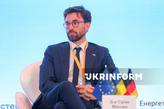Старший політичний радник Федерального міністерства економіки та енергетики Німеччини Сіріак Массюе бере участь у Німецько-українському енергетичному дні-2026, у межах якого українські та європейські урядовці, представники енергетичного бізнесу та експерти говорили про відновлення енергетичної системи України та її інтеграцію до енергетичного ринку Європи, Київ, 12 березня 2026 року. Захід відбувся в межах енергетичного партнерства між Україною та Німеччиною.
