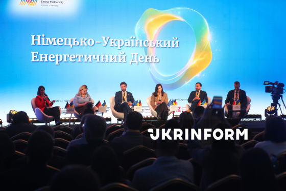 Директорка Power4JustTransition GIZ Ukraine Міріам Фаульветтер, заступниця міністра енергетики України Валентина Москаленко, старший політичний радник Федерального міністерства економіки та енергетики Німеччини Сіріак Массюе, директорка Європейсько-українського енергетичного агентства Анастасія Верещинська, інвестиційний менеджер Goldbeck Solar Хорхе Біче та керівник відділу енергетики та природних ресурсів у країнах Східної Європи, Кавказу та Центральної Азії департаменту розвитку банку KfW Томас Айзенбах (зліва направо) беруть участь у Німецько-українському енергетичному дні-2026, у межах якого українські та європейські урядовці, представники енергетичного бізнесу та експерти говорили про відновлення енергетичної системи України та її інтеграцію до енергетичного ринку Європи, Київ, 12 березня 2026 року. Захід відбувся в межах енергетичного партнерства між Україною та Німеччиною.