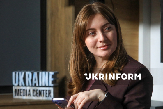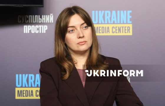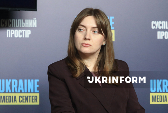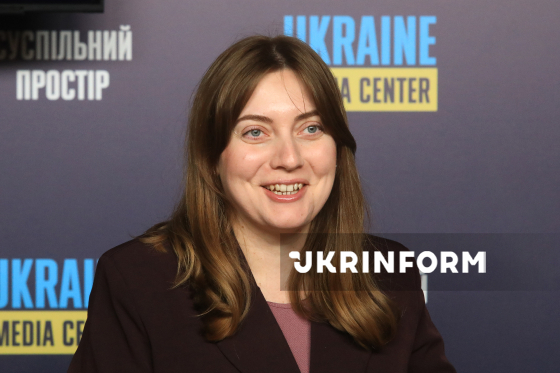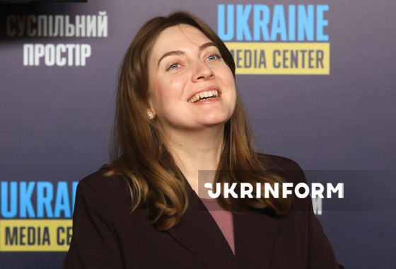 Лідерка Руху ЧЕСНО Віта Думанська бере участь у брифінгу на тему: Майбутні вибори: законодавчі зміни та політичні тенденції" у Медіацентрі Україна, Київ, 2 березня 2026 року.