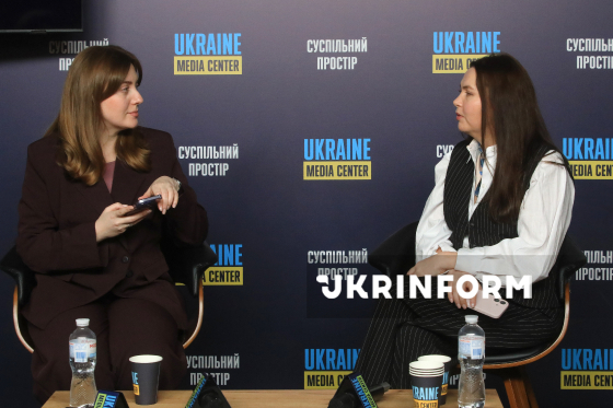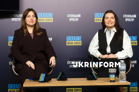 Парламентська аналітикиня Руху ЧЕСНО Ірина Корженкова (ліворуч) та лідерка Руху ЧЕСНО Віта Думанська беруть участь у брифінгу на тему: Майбутні вибори: законодавчі зміни та політичні тенденції" у Медіацентрі Україна, Київ, 2 березня 2026 року.